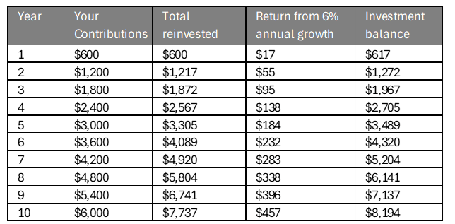 Let’s say you invest $50 each month ($600 a year) with an average annual return of 6%. After 10 years, your investment could grow to around $8,194, even though you would have only contributed $6,000.