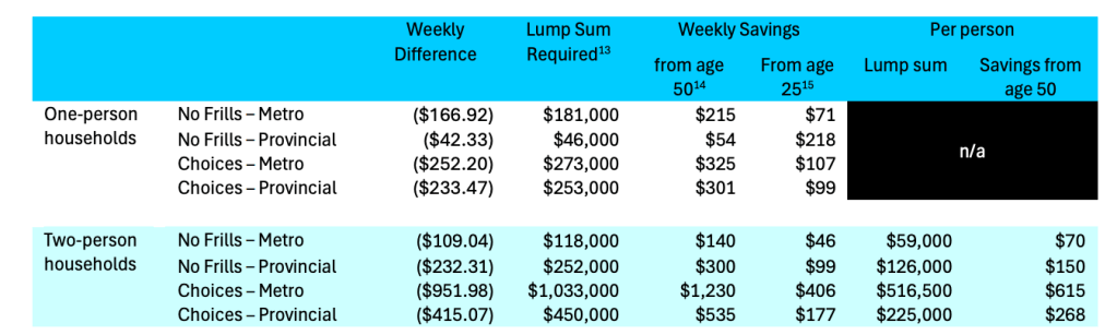 The Guidelines also estimate how much retirees need in lump sum savings to supplement NZ Super. As the table below shows, numbers vary widely depending on the household type, location and lifestyle of choice.