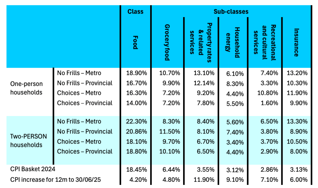 In the year to June 2025, the cost of housing (with rates, insurance and maintenance costs increasing), renting, healthcare, utilities and energy bills rose between 4.2% and 11.9% – all faster than the official inflation rate.